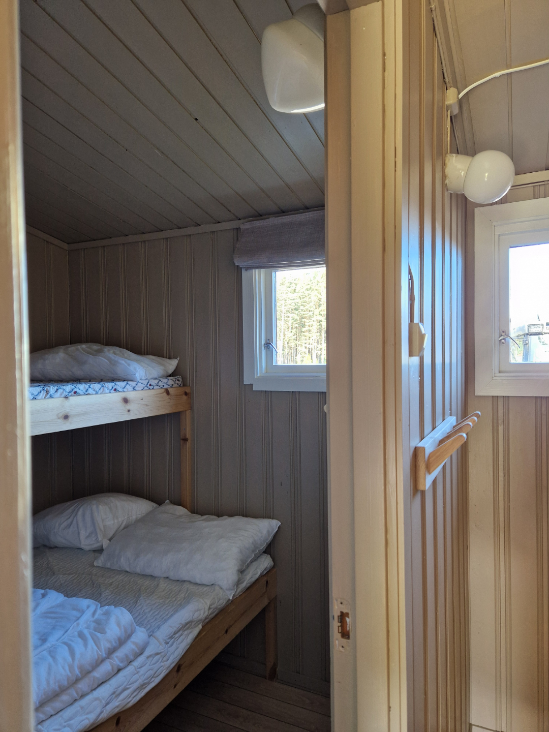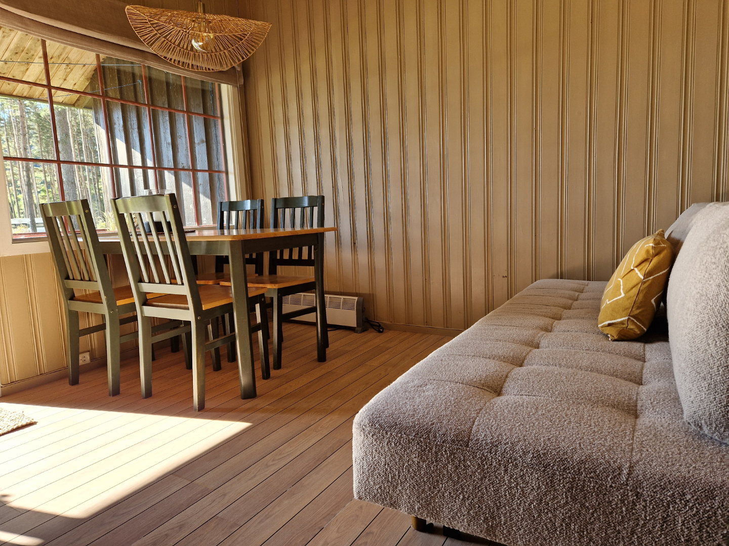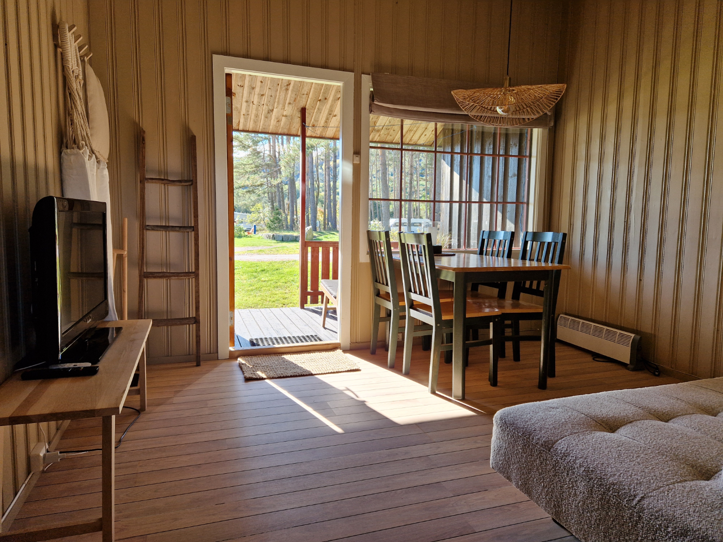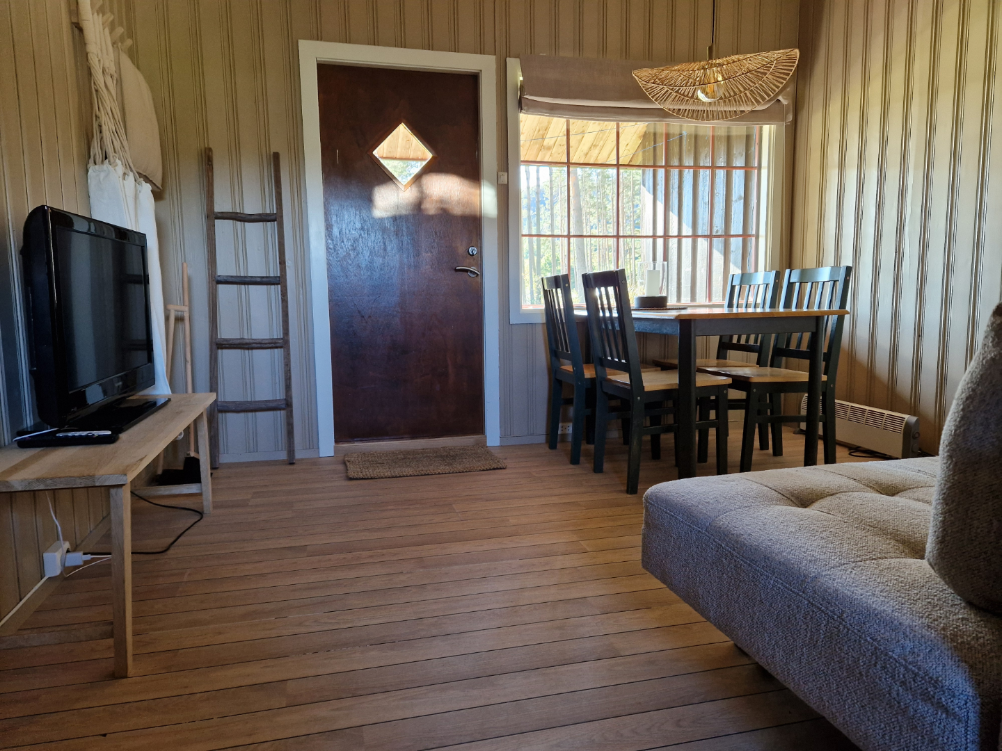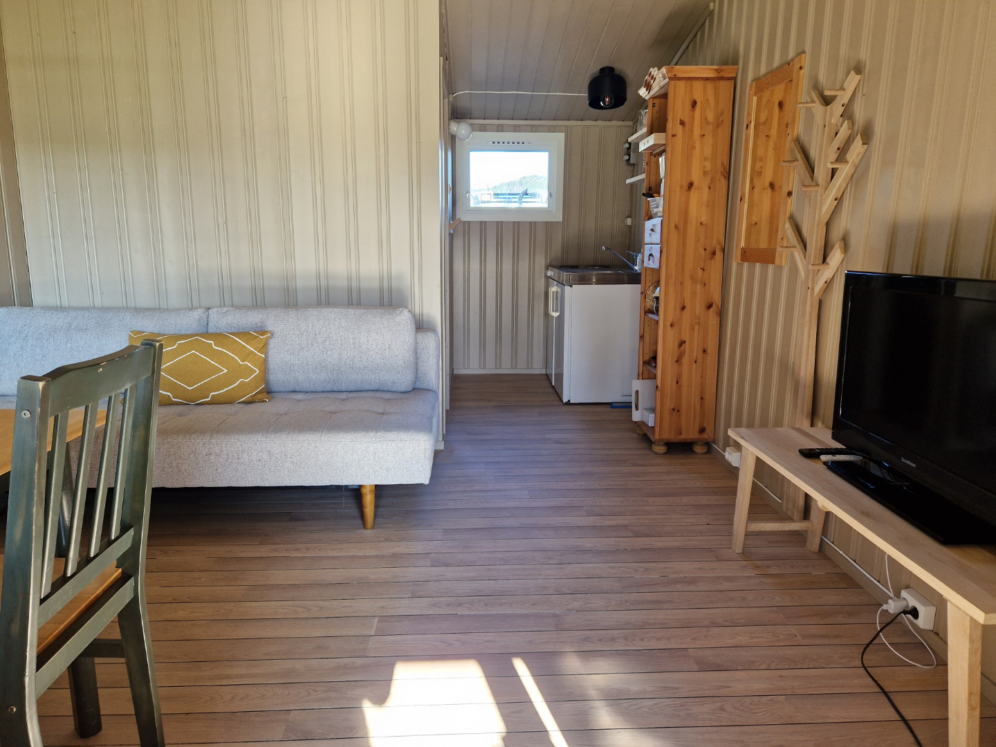 Nyoppusset campinghytte med enkel standard. Den har et lite soverom med seng og køyeseng, i tillegg til en sovesofa i stua. Hyttene har ikke dusj og toalett (benytt sanitærlegg), men de har en enkel kjøkkenkrok med vann, kokeplater og kjøleskap. TV og WIFI. Parkering rett utenfor hytta.